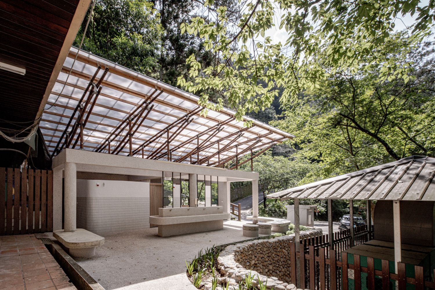 單斜竹構屋面輕巧延展,創造出半戶外休憩區,透光中空版材引入自然光與綠意。