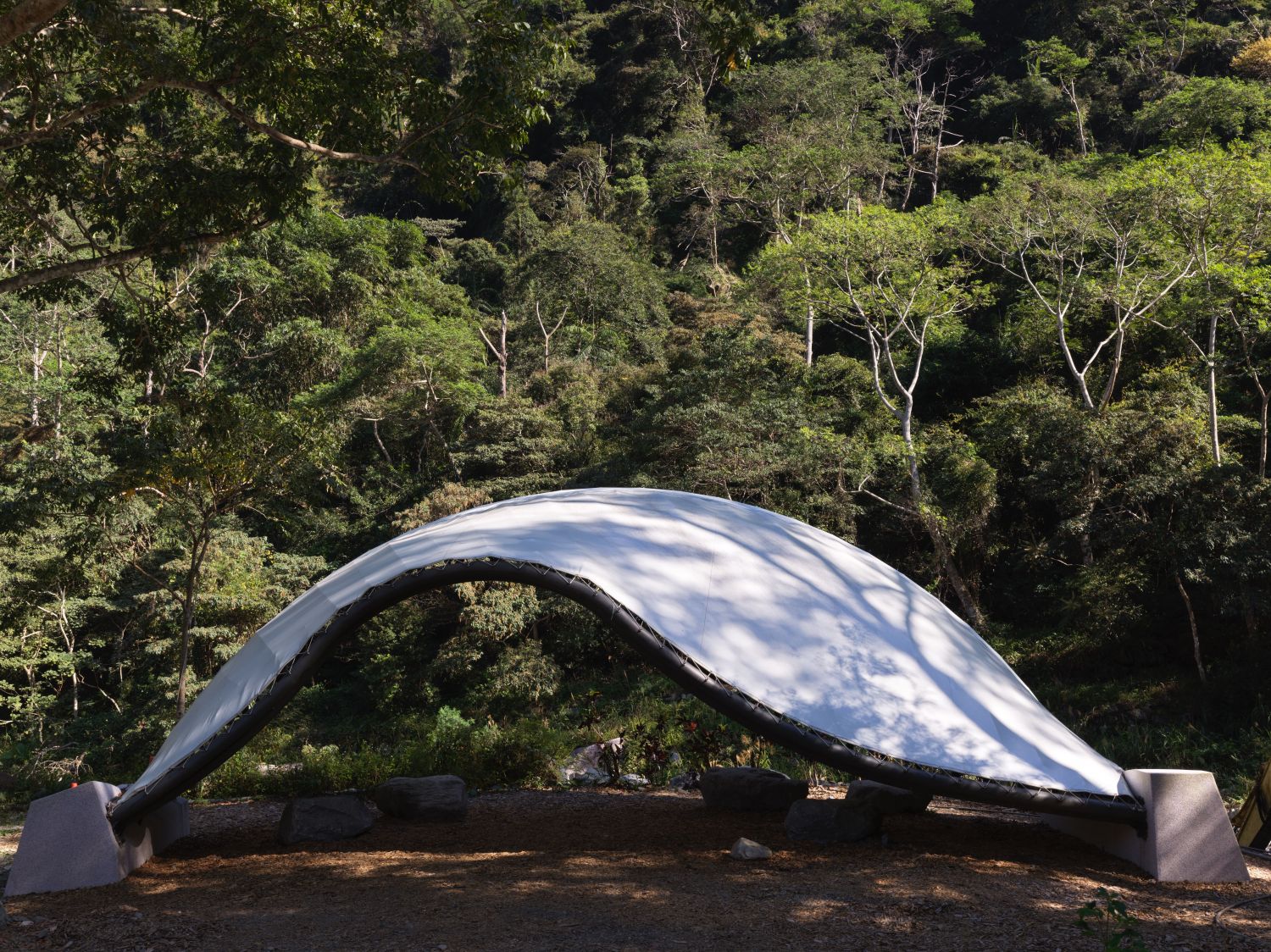 以鋼管支撐弧形大棚架,竹材編織屋面,PVC外層材輕盈保有聲音迴盪的彈性。