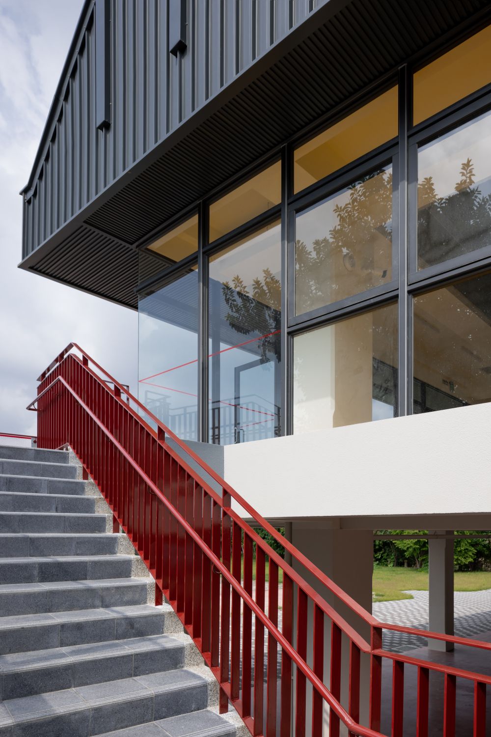 結構系統的選用與柱跨距是不同空間使用的合理化結果,教室隔間多跨度小採用混凝土柱樑框架,二樓為一片格子梁陣列的混凝土樓板作為舞台與球場,斜面屋頂是考量羽球飛行路徑優化的角度採用鋼構斜梁支撐。這棟建築的外觀材料直接反映著內部的構造關係,黑色厚重的三角形金屬屋頂、水平玻璃腰帶與白色混凝土基座,三個部位透過傳遞重力的柱子緊繫在一起,角落的紅色A型柱從地面升起穿越二樓板把屋頂拉住,厚重的六邊形柱從建築的中央插入地面形成一樓空間的主宰。具有象徵性的柱子、三角屋頂、紅色樓梯也成為水源國小活動中心的記憶點。