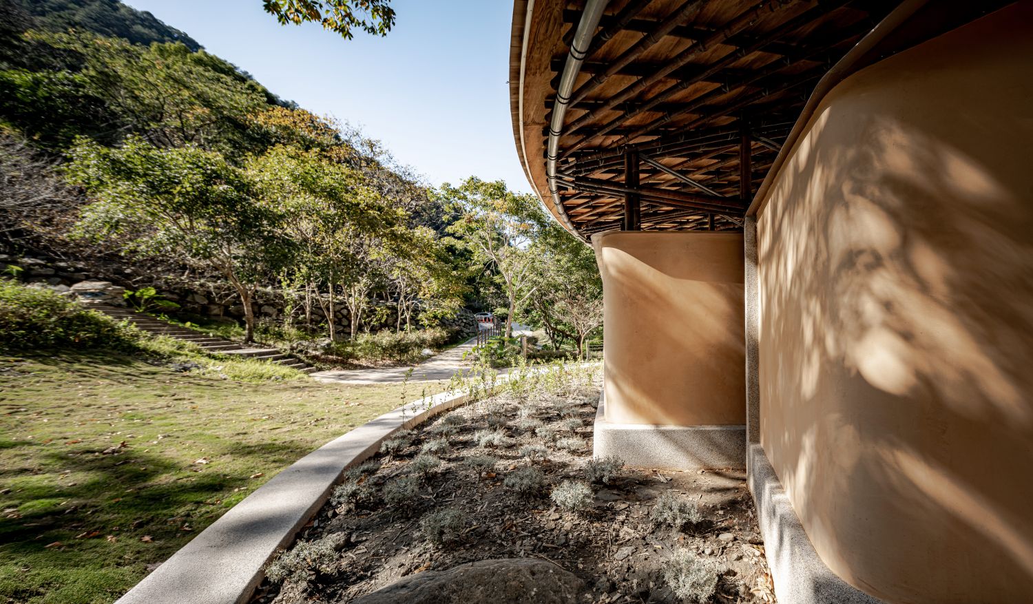 竹構屋頂如葉子漂浮,拱形桁架營造半戶外空間,夯土牆體與RC結構複合相映,形塑出沉穩自然的石與土意象。