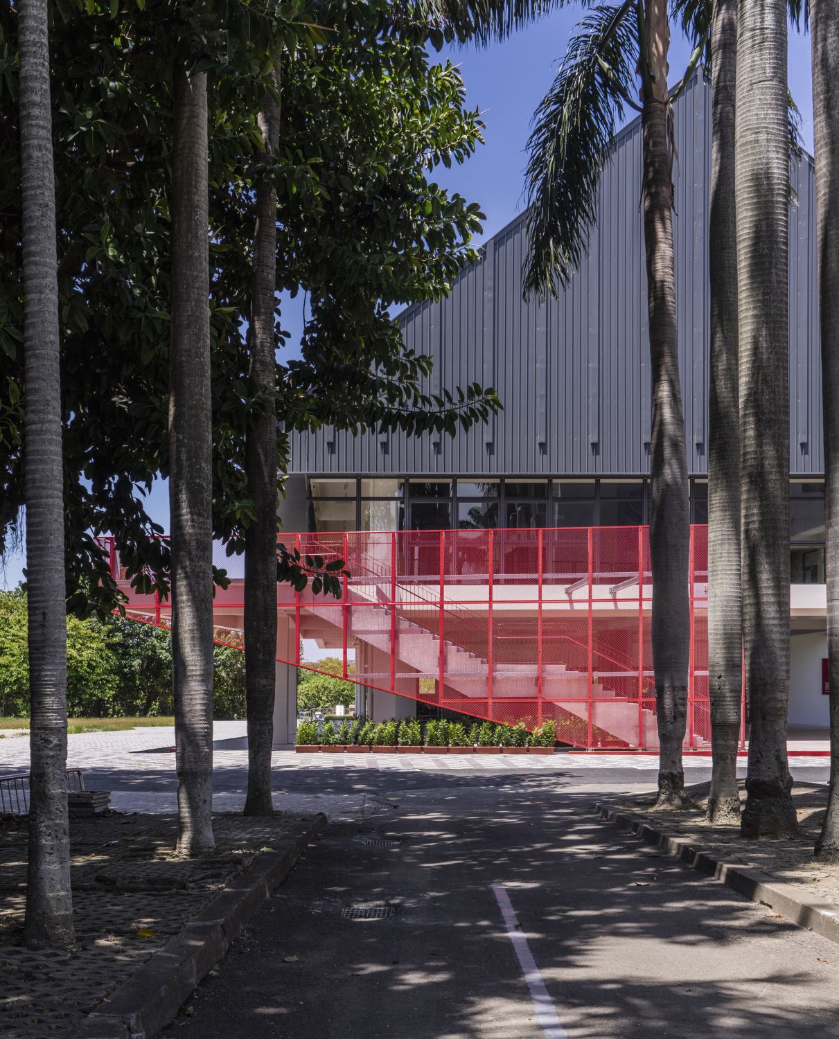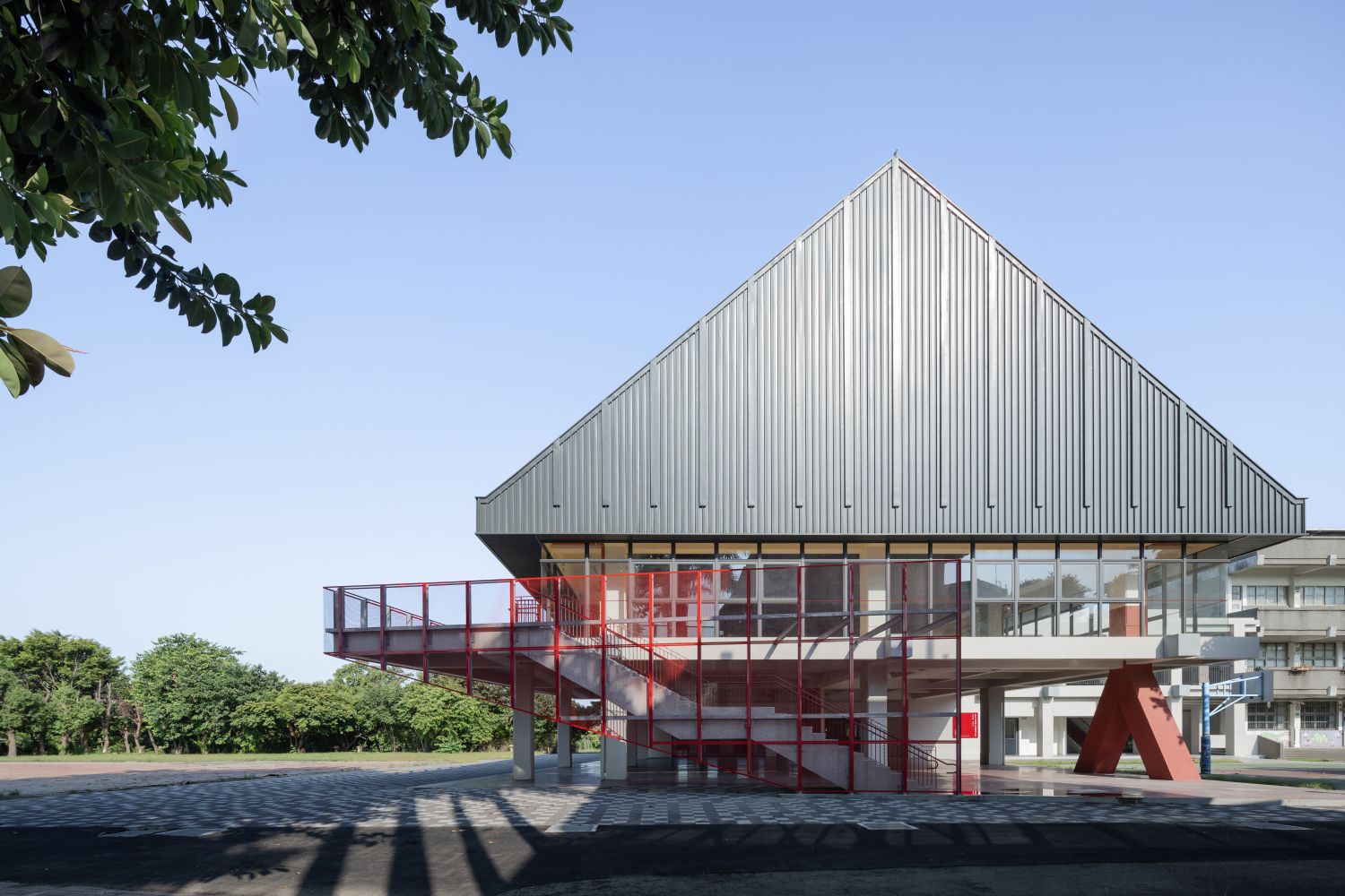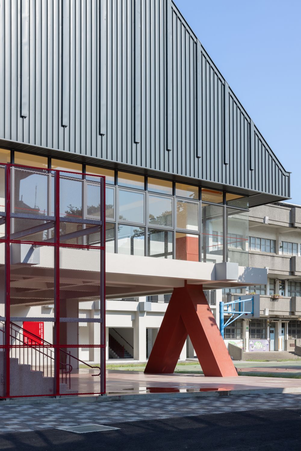 結構系統的選用與柱跨距是不同空間使用的合理化結果,教室隔間多跨度小採用混凝土柱樑框架,二樓為一片格子梁陣列的混凝土樓板作為舞台與球場,斜面屋頂是考量羽球飛行路徑優化的角度採用鋼構斜梁支撐。這棟建築的外觀材料直接反映著內部的構造關係,黑色厚重的三角形金屬屋頂、水平玻璃腰帶與白色混凝土基座,三個部位透過傳遞重力的柱子緊繫在一起,角落的紅色A型柱從地面升起穿越二樓板把屋頂拉住,厚重的六邊形柱從建築的中央插入地面形成一樓空間的主宰。具有象徵性的柱子、三角屋頂、紅色樓梯也成為水源國小活動中心的記憶點。