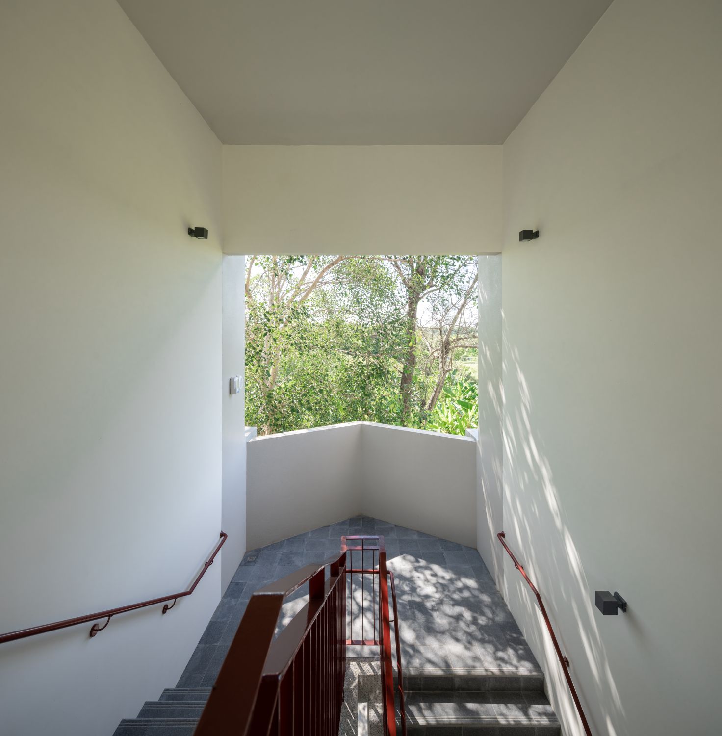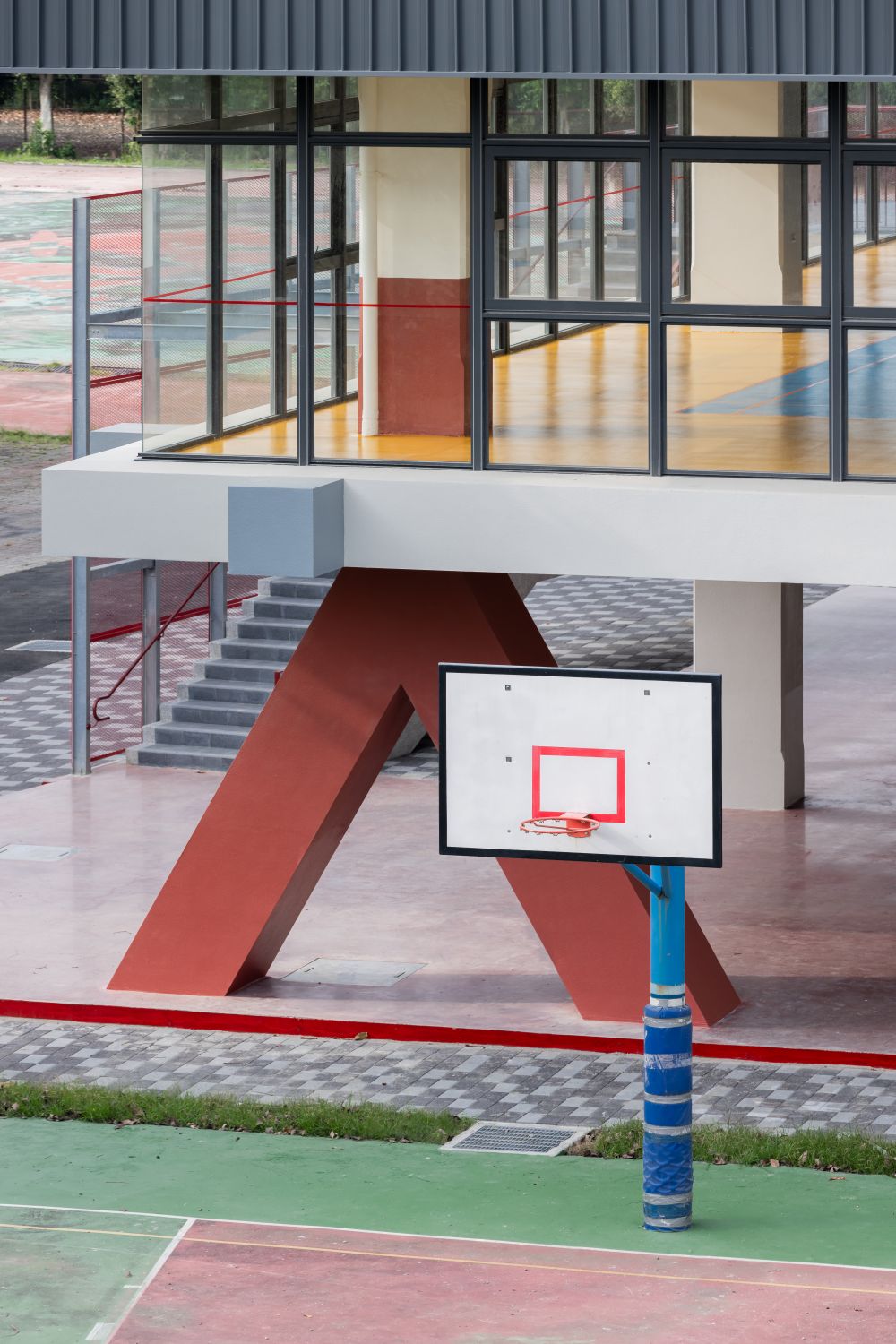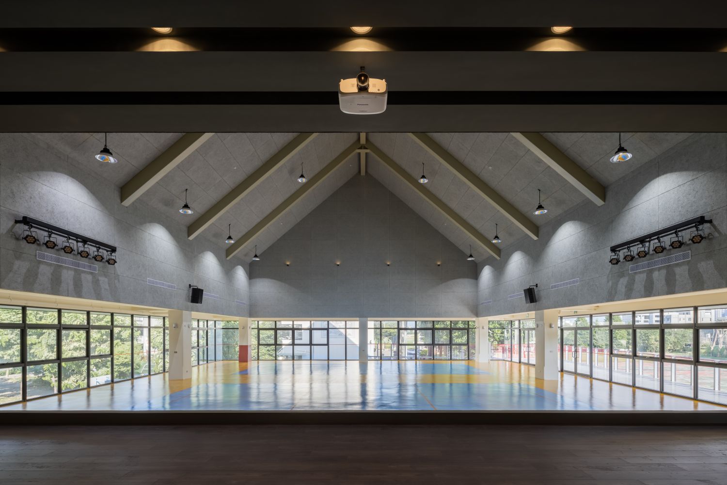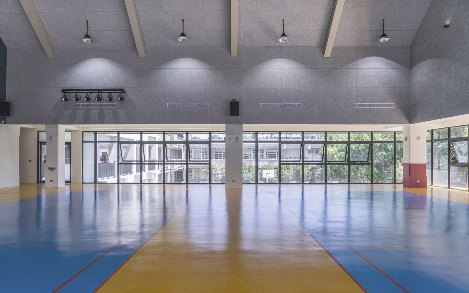 在量體配置上將建築物抬高讓一樓成為連接中庭與跑道的挑高半戶外空間,原本封閉的校舍與運動場域因此有了更良好的串聯,同時安排在北側的多功能教室擋住了北風讓中心形成有領域感的活動區域,緊鄰幼兒園教室能提供學校額外的風雨場所,架高的活動中心延續原建築群配置與操場偏移的軸線在二樓的露台與樓梯相交,這略為轉向的樓板也順勢成為運動場的看台。