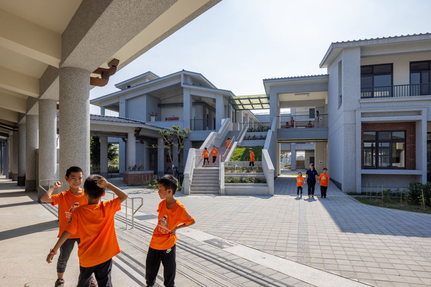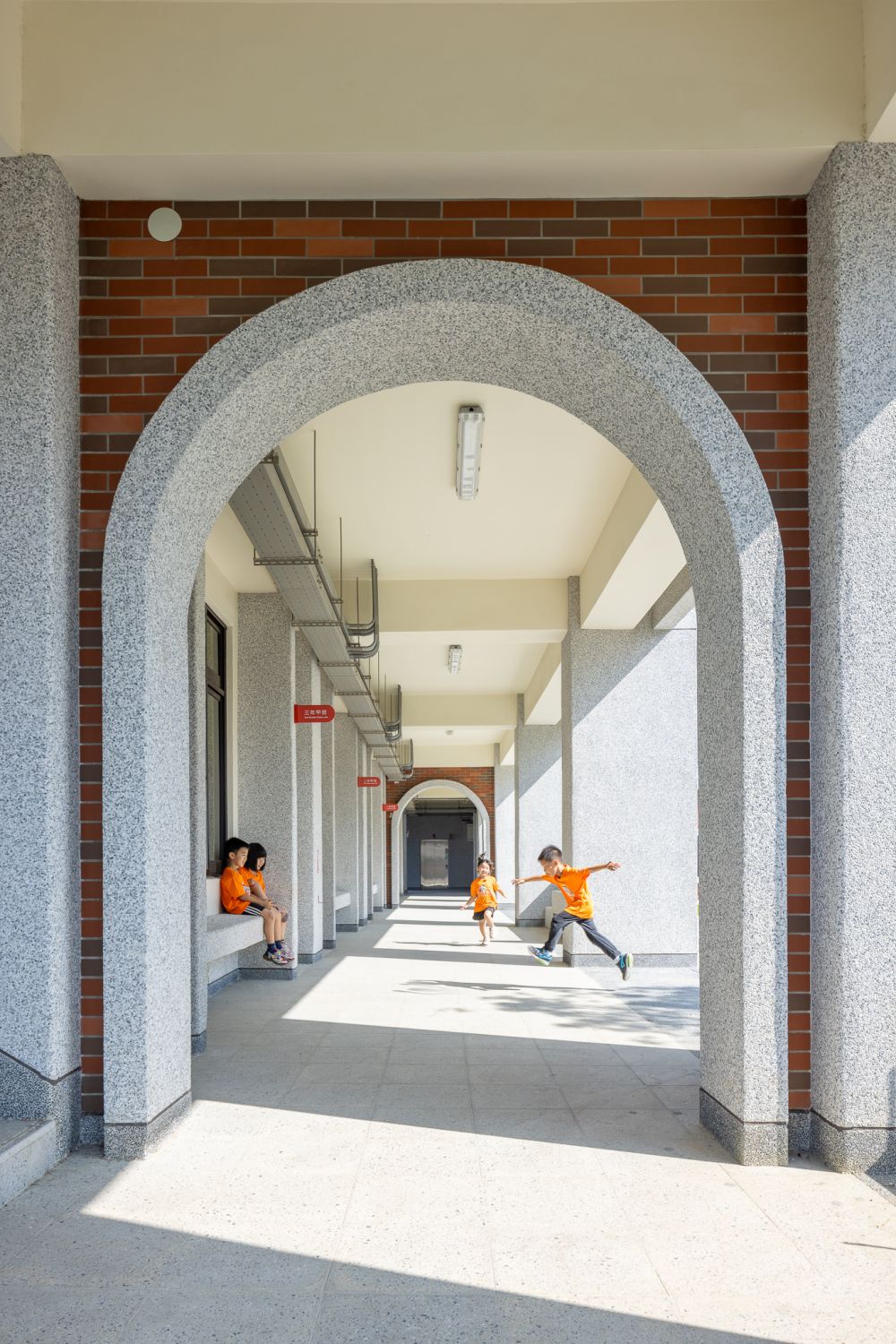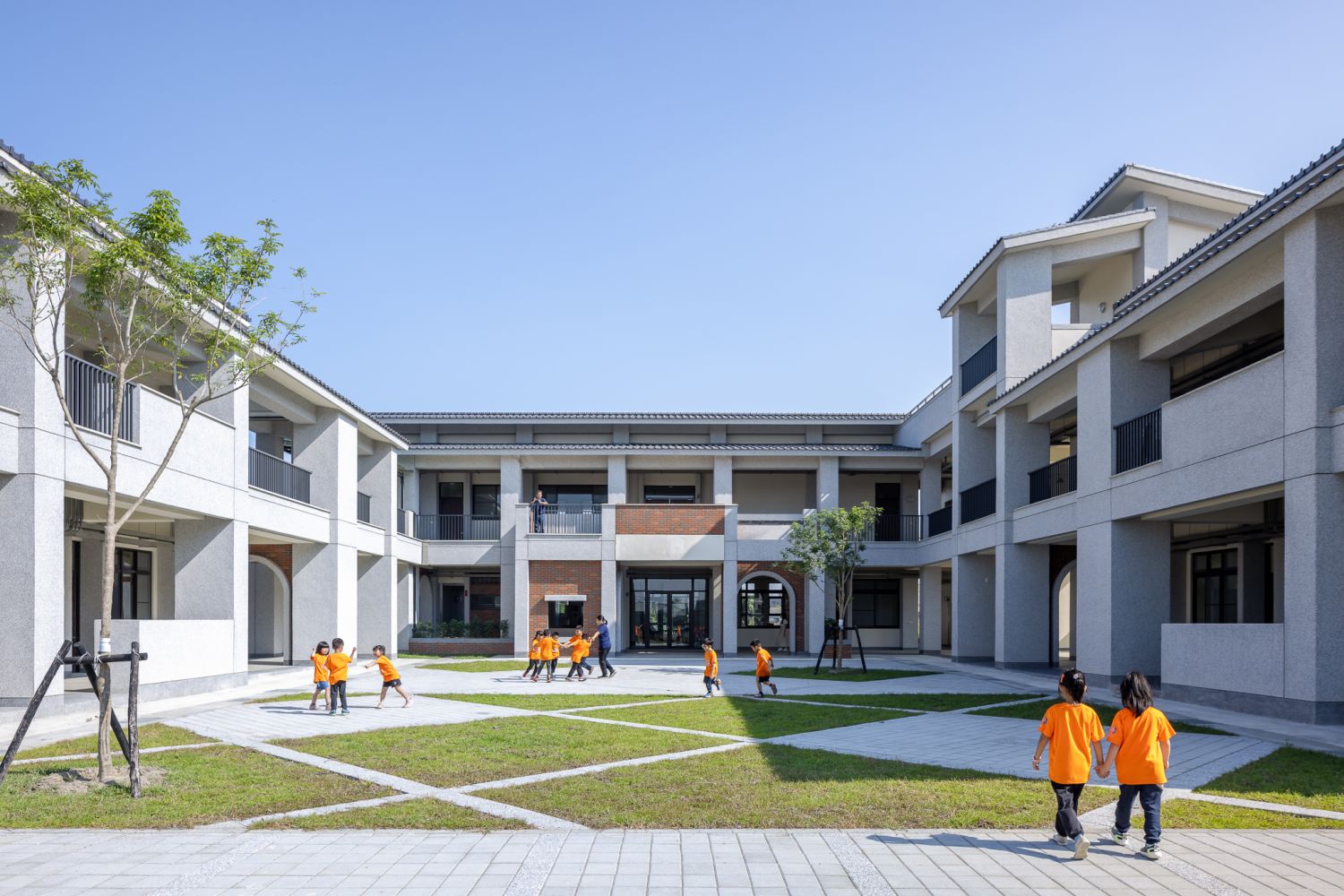 在合院量體中,藉由南側的半戶外劇場與戶外生態梯,引進南風與陽光。來惠學埕的圖書角、圓拱廊道營造的光影,呈現了合院美學的空間感。融合傳統合院與現代手法的鋪面設計,讓孩子們在綠意與廣場間穿梭,享受自然與學習。