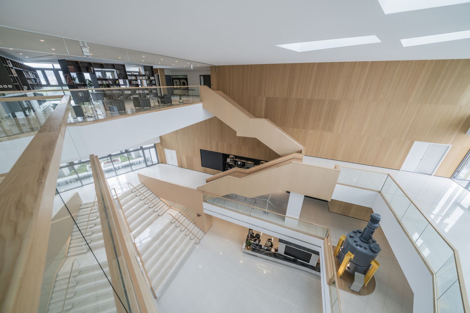 促進交流共享,匯集知識 培育創新思惟。整體園區以「知識峽谷」為主要空間概念,以挑高的室內大廳整合各類型空間,並於周邊環繞以平台、討論間、會議、展示空間等共享空間鼓勵同仁間的交流互動,匯集知識,並促進培育創新思惟 。