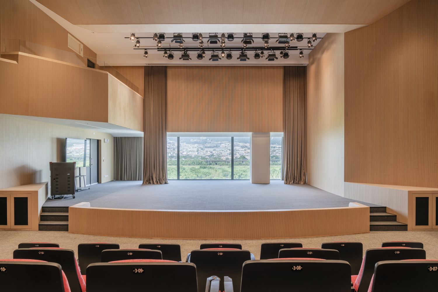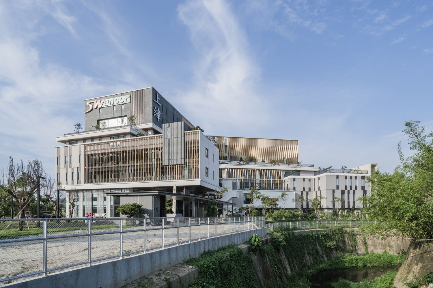 與自然環境協調,友善面對社區。建築物與周邊環境有自然和諧的關係,在量體配置上以層疊的姿態迎向河景,並以較低矮的量體面對鄰近社區和田園景觀。錯落配置的露台,除了有良好的視野景觀外,配合多層次的綠化,也將辦公室環繞於綠意之中。除了滿足企業自身營運,也期望顧勵推展地方文化並與社區互動交流,深耕企業價值。